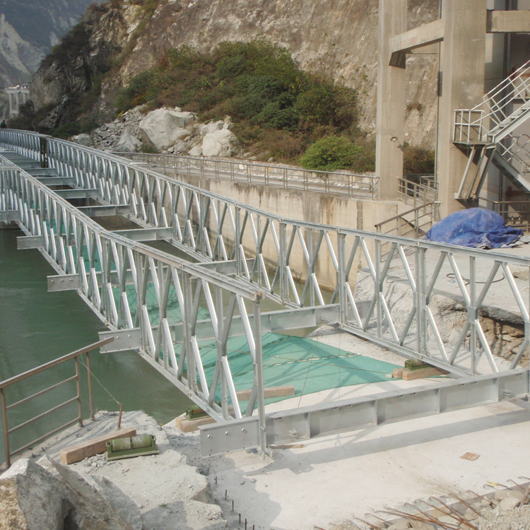鋼便橋以高強(qiáng)鋼材制成輕便的標(biāo)準(zhǔn)化桁架單元構(gòu)件及橫梁、縱梁、橋面板、橋座及連接件等組成,用專用的安裝設(shè)備可就地迅速拼裝成適用于各種跨徑、荷載的桁架梁橋。在第二次世界大戰(zhàn)中,曾被大量用于歐洲及遠(yuǎn)東戰(zhàn)場(chǎng),搶修橋梁或架設(shè)臨時(shí)便橋。戰(zhàn)后,貝雷銷橋經(jīng)過(guò)改進(jìn)轉(zhuǎn)為民用。美國(guó)的改進(jìn)型定名為阿克羅格構(gòu)式橋。中國(guó)公路部門采用16mn鋼材設(shè)計(jì)并定名為裝配式公路鋼便橋,一套器材可架設(shè)9、12、15……60、63米跨徑的單行道橋梁,通過(guò)汽車10級(jí)、汽車15級(jí)、汽車20級(jí)、履帶50、掛車80的荷載。這種橋梁構(gòu)件也大量用作施工支架或塔架。